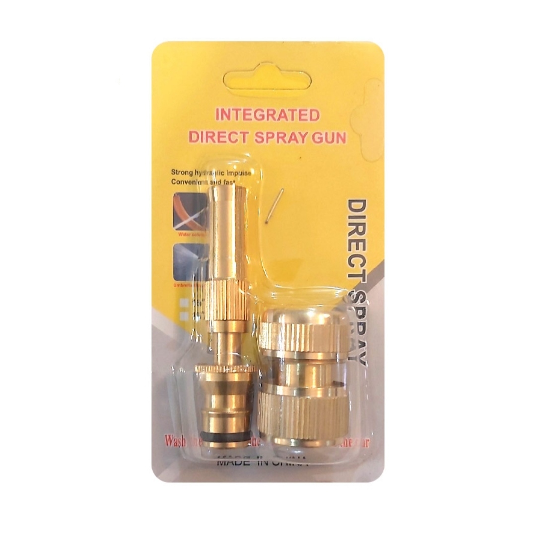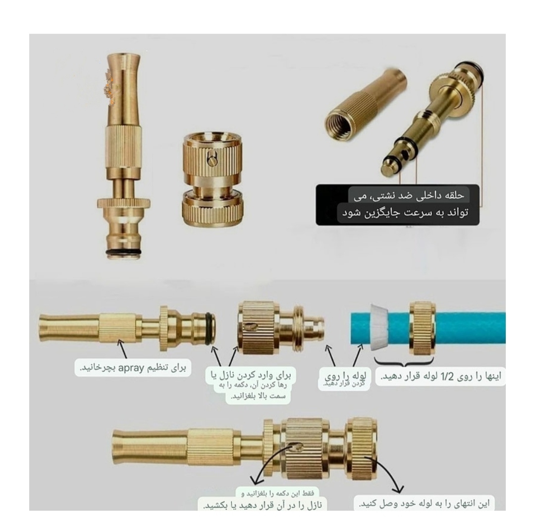 نازل کارواش برنجی دو تکه، آب باش سرشلنگی از جنس برنج Brass Nozzle Water Spray Gun 2 parts قطعه ای است که بنوعی از سرشیلنگ می باشد که آب را به شکل های متفاوت اسپری می کند. نحوه اتصال این نازل کارواشی برنجی در تصاویر مشخص است.